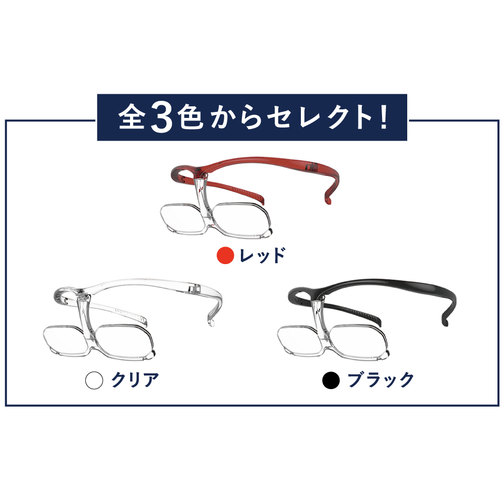 〇通常時メガネを使用の方は、正しく検眼された遠近両用メガネや老眼鏡の上から重ね掛けください。
